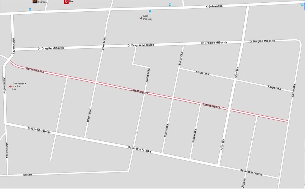 Због радова трећег лица настала је хаварија у Гутенберговој улици бб. Због поправке водоводне мреже у прекиду је водоснабдевање до 18 часова у наведеној улици, али је могућ прекид у околним улицама ( Милутина Бојића, Гламочка, Голубачка, Буковичка, Гружанска, Изворска, Жупанска ) и на простору између Алексиначке и Кубанске улице.